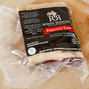 Our Traditional Pancetta Tesa is a flat, dry-cured pork belly that showcases the rich, savory essence of Italian charcuterie. Generously seasoned with a blend of garlic, fresh rosemary, fragrant juniper berries, and aromatic bay leaves, each ingredient imparts layers of earthy, herbal flavors. The curing process allows these bold, rustic notes to deeply infuse the pork, resulting in a beautifully balanced and intensely flavorful pancetta. With its silky texture and aromatic complexity, this pancetta is perfect for cooking, adding depth to dishes, or unlike american store bought pancetta you can enjoy it thinly sliced on its own.