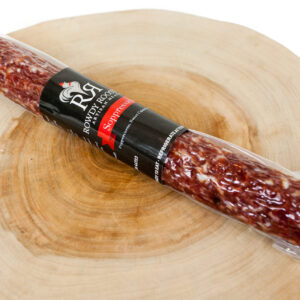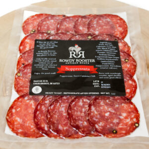 Our Whole Peppercorn Soppressata is a mellow peppered salami, featuring whole black peppercorns that add a robust, spicy bite to here and there. Infused with red chili flake, it has a very subtle heat balanced by a delicate sweetness, enhancing the depth of the pork’s natural flavors. A splash of rich Cabernet wine adds a touch of acidity and complexity, elevating the overall taste profile. Slow-cured for a perfect texture, this artisanal soppressata is a approachable blend of spice and sweet with a hint of tang from the wine and the natural fermentation process.